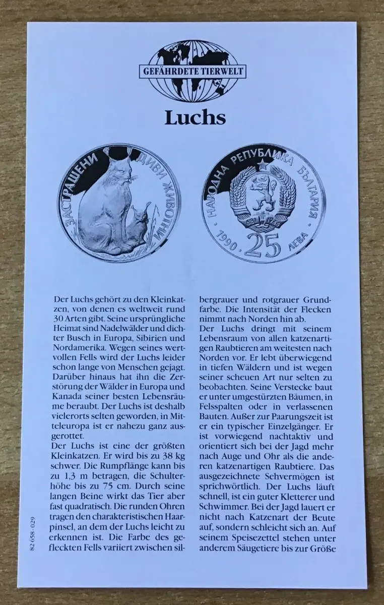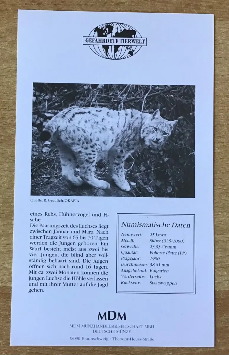 Bulgarien 25 Lewa 1990 Luchs Silber PP mit Zertifikat
