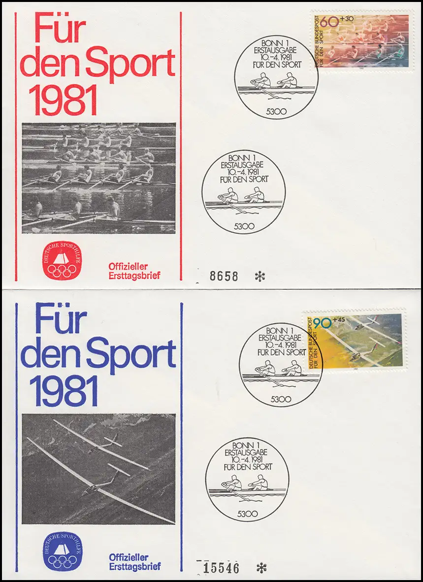 Bund 1094-1095 Sporthilfe 1981: Rudern und Segelfliegen auf 2 amtl. FDC