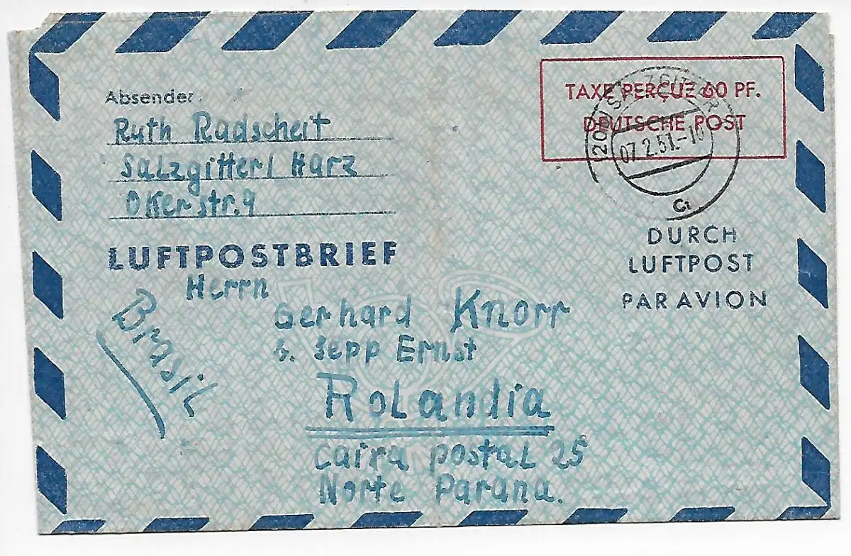 Bund 1951: Gebühr bezahlt Salzgitter nach Rolandia/Brasilien, Luftpost 4F