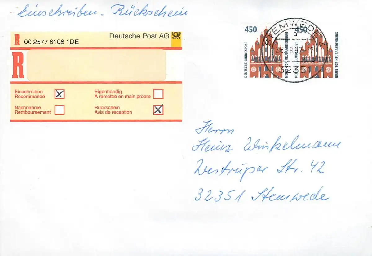 Bund: Einschreiben Rückschein Stemwede mit MiNr. 1623, Mehrfachfrankatur