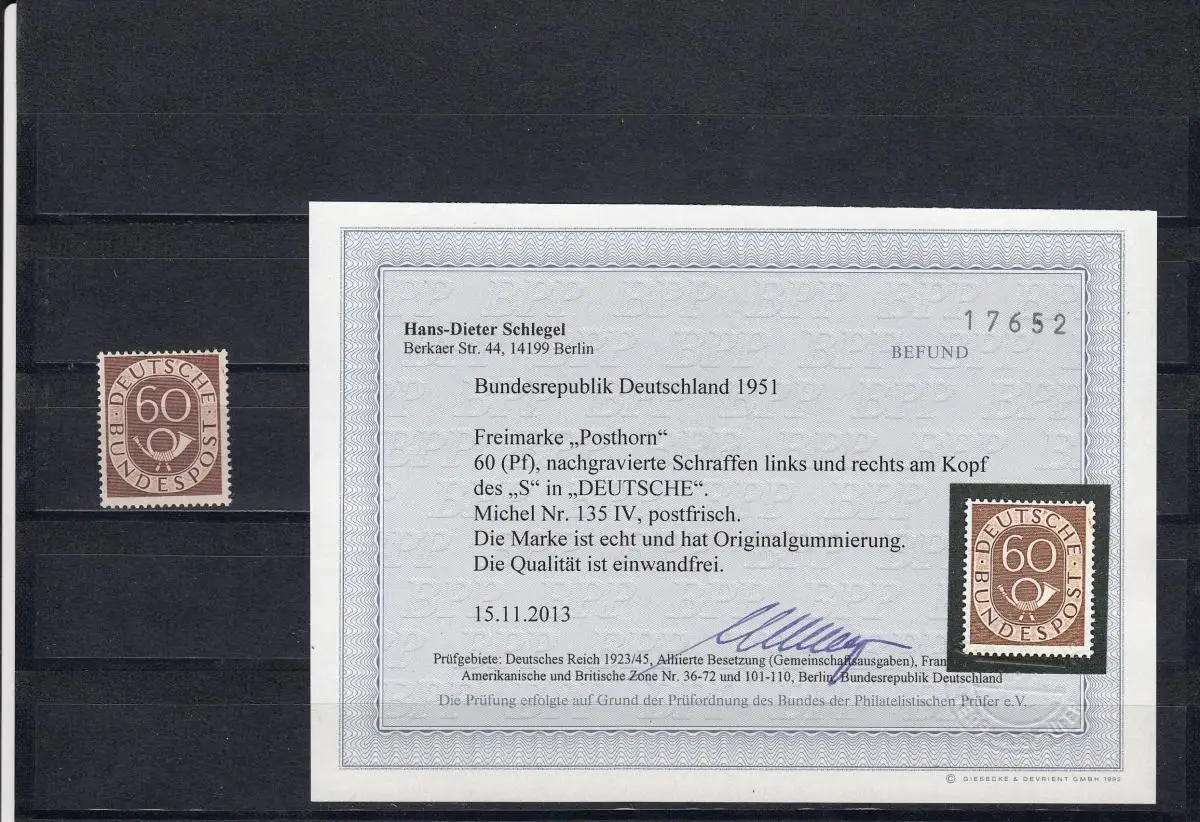 Bund: MiNr. 135 IV, postfrisch mit Plattenfehler, BPP Befund