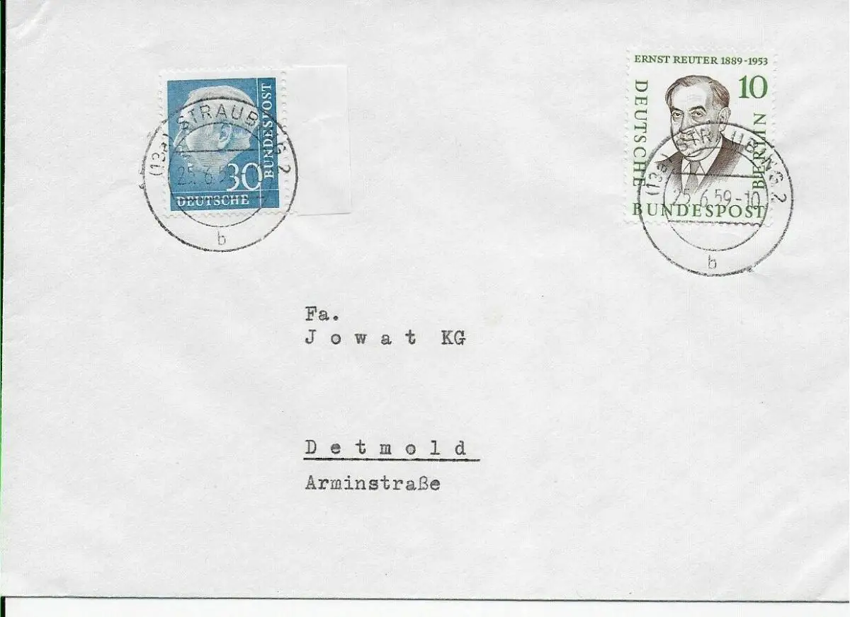 Bund: MiNr. 187, Seitenrand von Straubing nach Detmold 1959