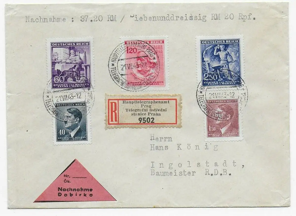 B&M: Nachnahme Einschreiben Haupttelegraphenamt Prag nach Ingolstadt