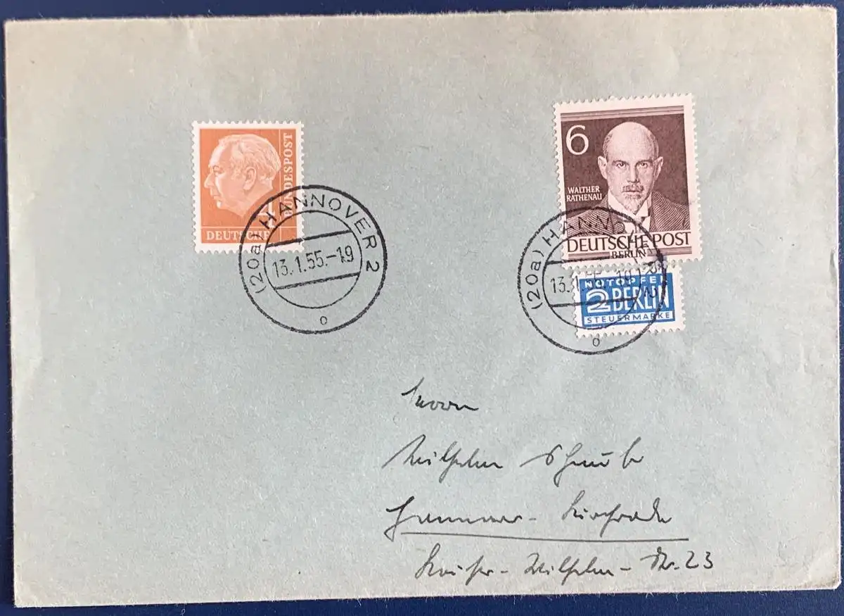 Bedarfsbrief, Bund, frankiert mit Berlin, Mi.Nr. 93 + Bund, Mi.Nr. 178 und Notopfer, gelaufen mit Poststempel vom 13.01.1955 in Hannover.