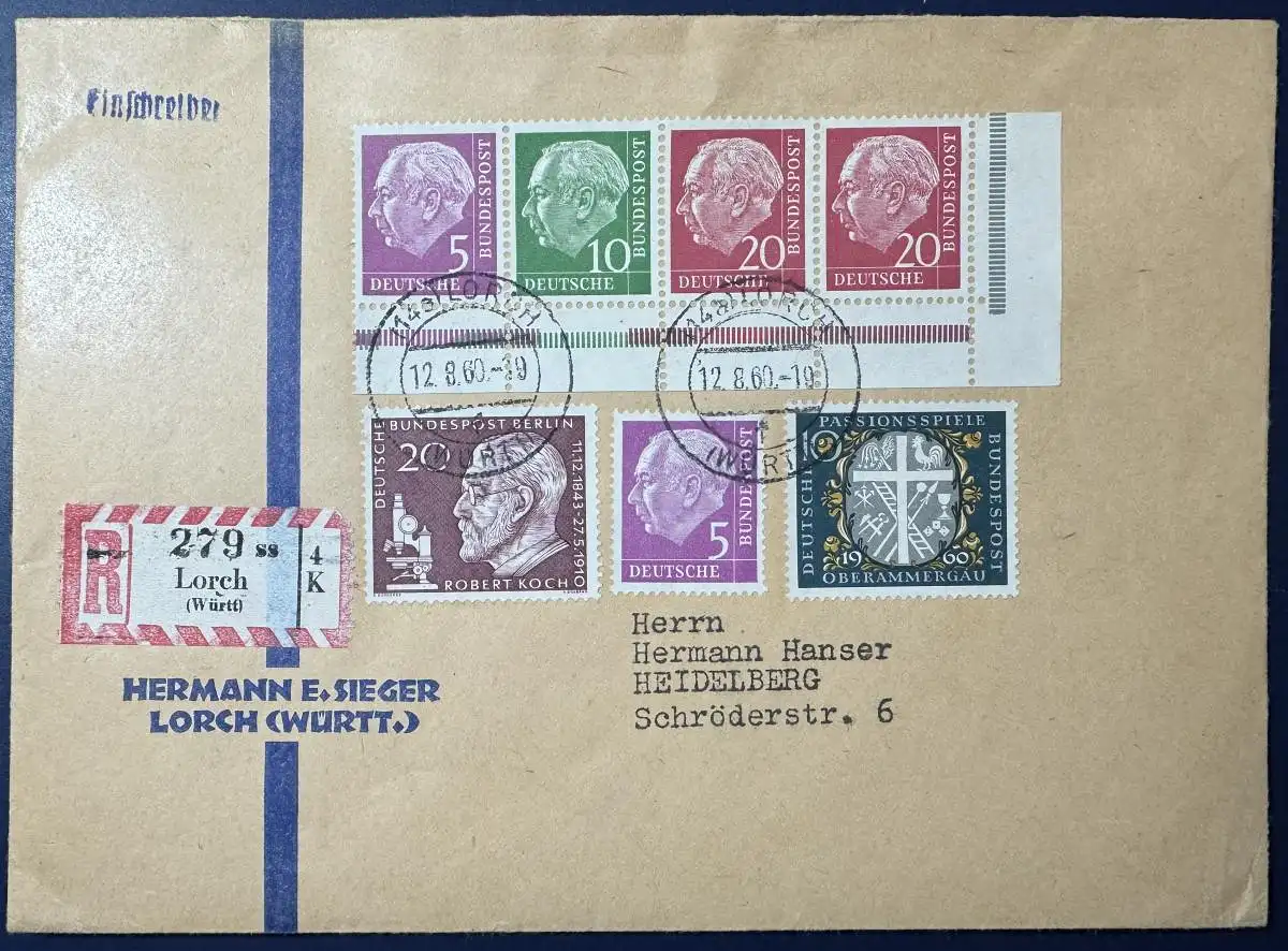 Mischfrankatur, bestehend aus Mi.Nr. 179+183+185+185 (Zusammendruck Heuss Markenheftchenbogen 5, Unterrand rechts), Einzelwert Mi.Nr. 179, Mi.Nr. 329 und Berlin Mi.Nr. 191. Gelaufen als Einschreiben mit Poststempel vom 12.08.1960 von Lorch nach Heidelberg, saubere Stempelung, Brief ist sehr gut erhalten.