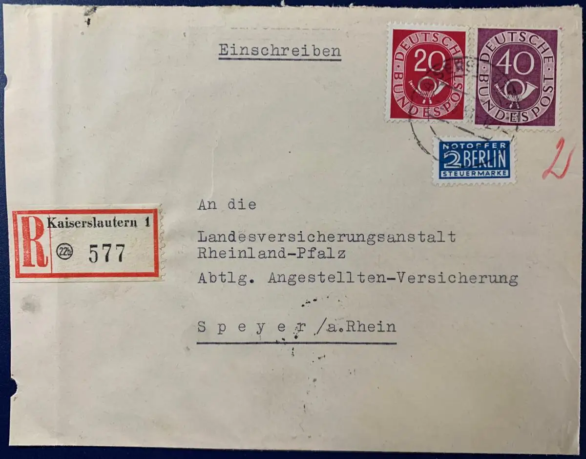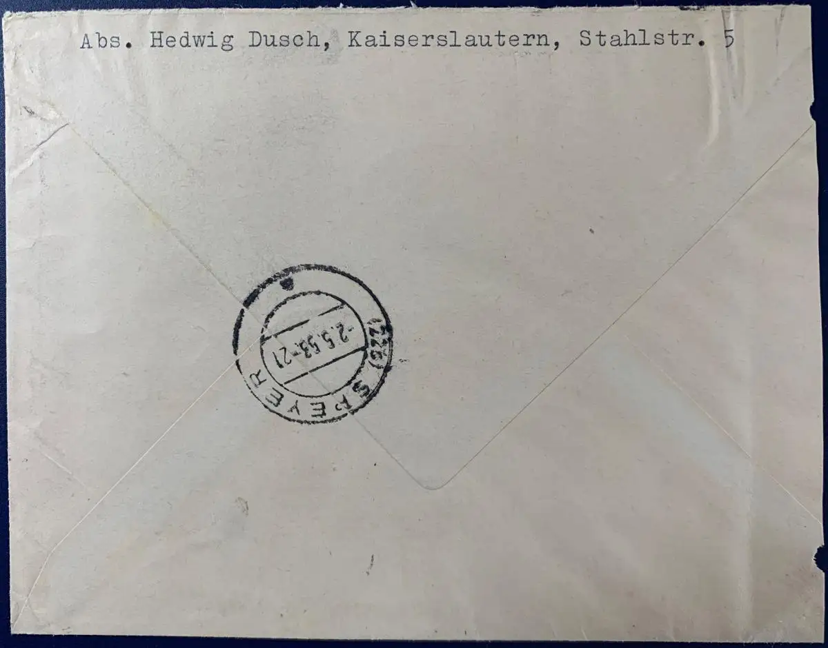 gelaufen als Einschreiben mit Poststempel vom 02.05.1953 von Kaiserslautern nach Speyer. Brief ist am linken Rand beschnitten, ansonsten gute Erhaltung.