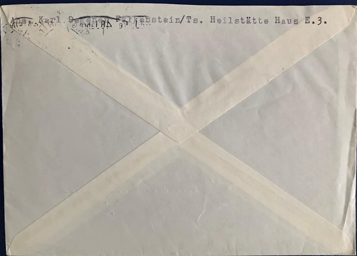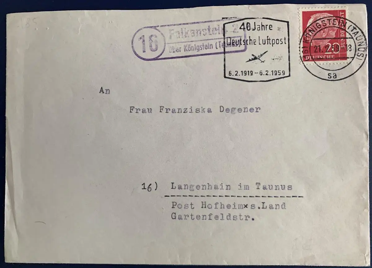 Brief mit Landpoststempel Falkenstein 2, frankiert mit Mi.Nr. 185, entwertet mit Poststempel vom 21.02.1958, gelaufen von Falkenstein (Landpoststempel) über Königstein nach Langenhain/Taunus.