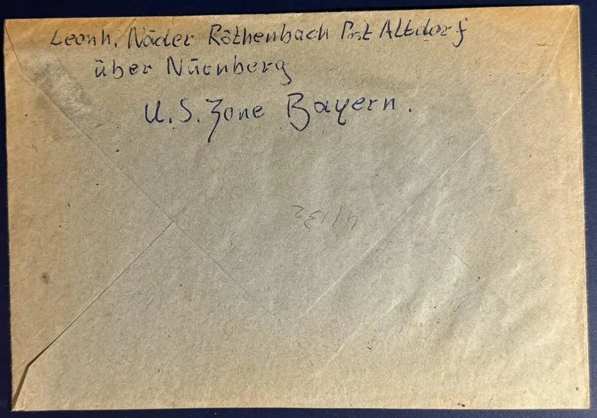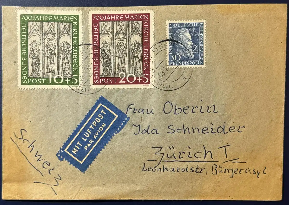 Bedarfsbrief, Bund, 1952, Mischfrankatur, bestehend aus Mi.Nr. 139/140 und 147, gelaufen per Luftpost mit Poststempel vom 08.01.1952 von Altdorf b. Nürnberg nach Zürich (Schweiz). Brief hat an den Rändern Vergilbung, ansonsten sehr gut erhalten.