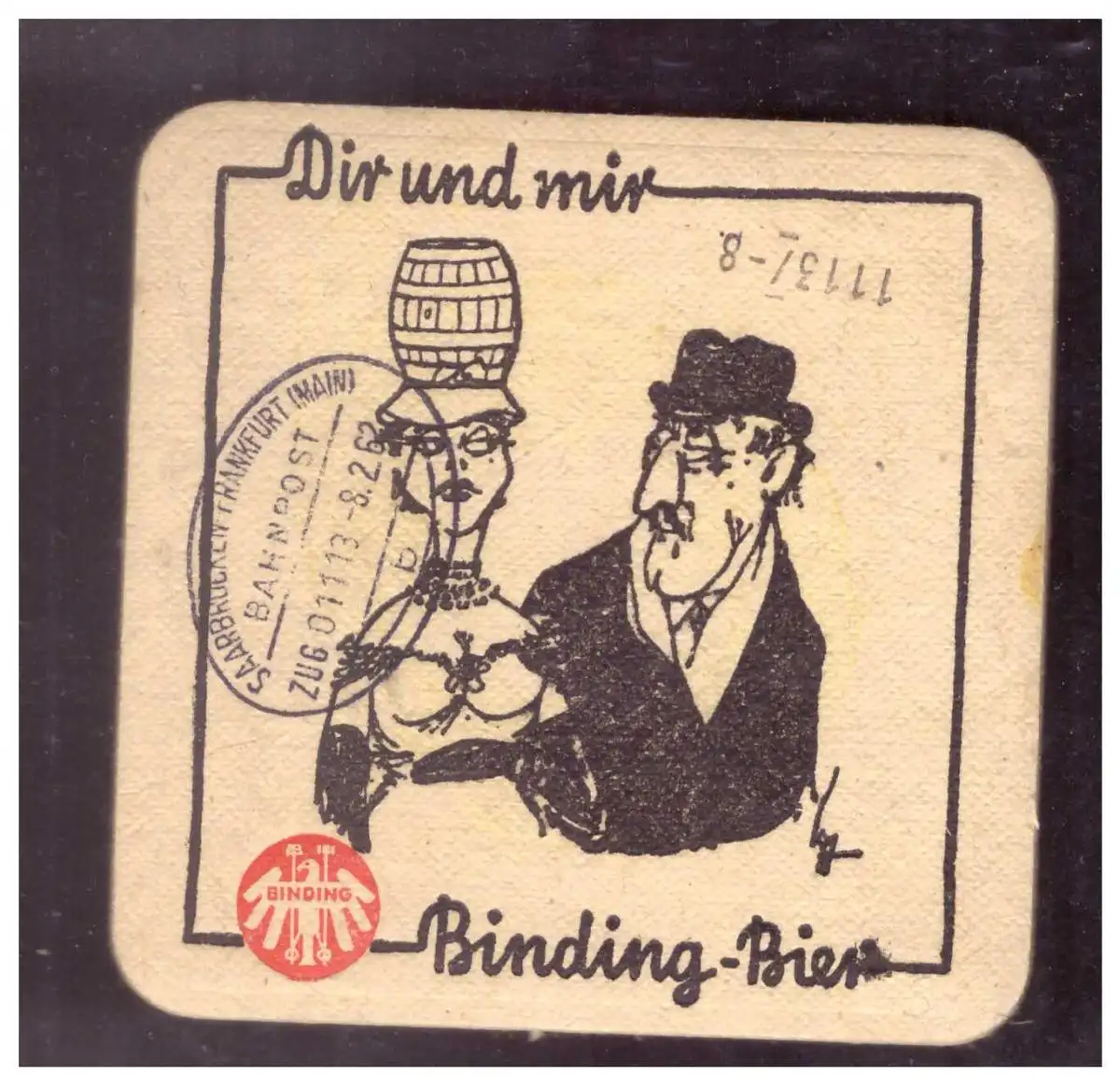 Bund (020174) Bierdeckel Binding- Bier mit Bahnpoststempel, Saarbrücken- Frankfurt 8.2.1962