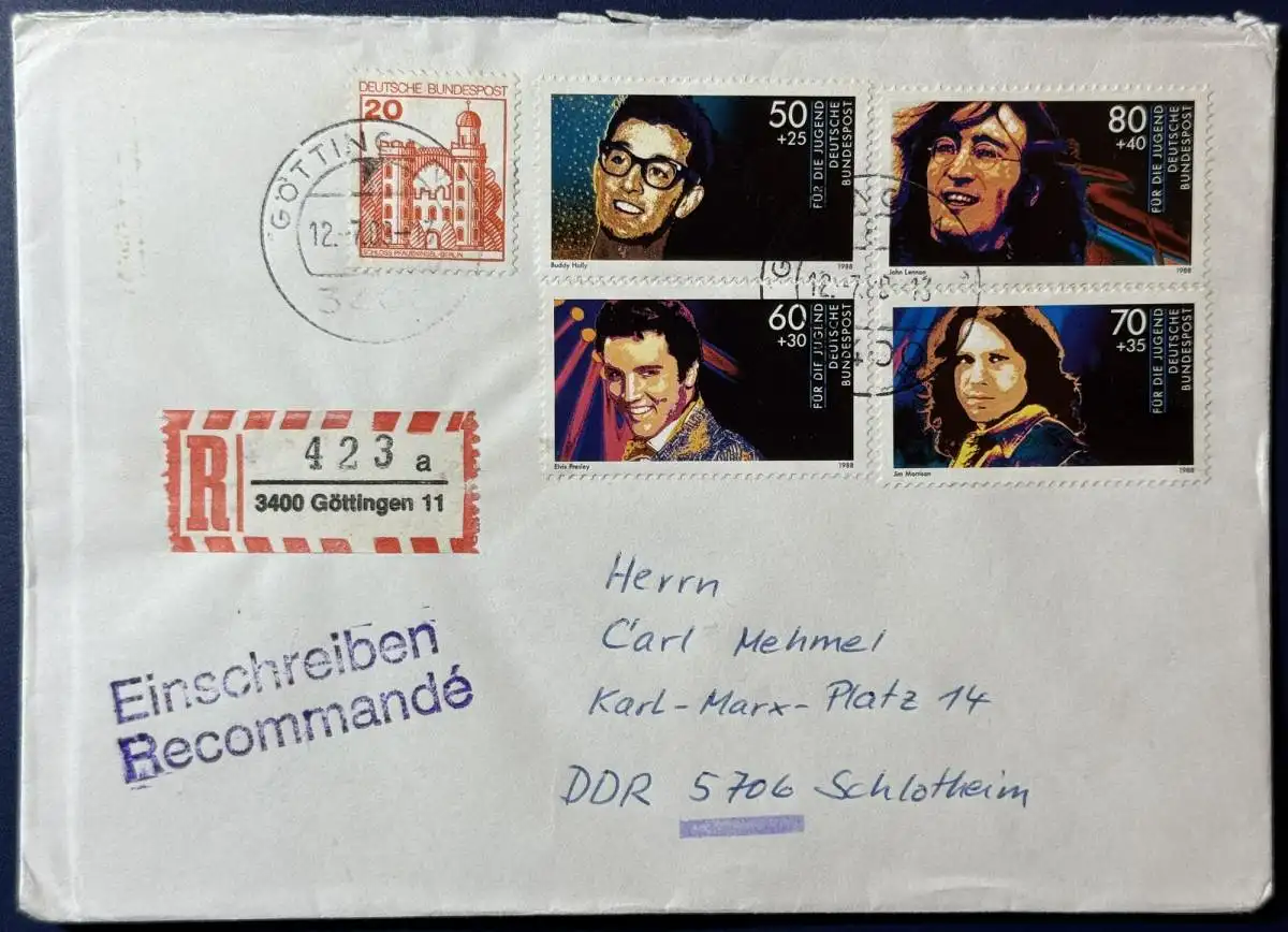 Bund, Einschreiben, 1988, frankiert mit Mi.Nr. 1360-1363 und 995, gelaufen mit Poststempel vom 12.07.88 von Göttingen nach Schlotheim (DDR).