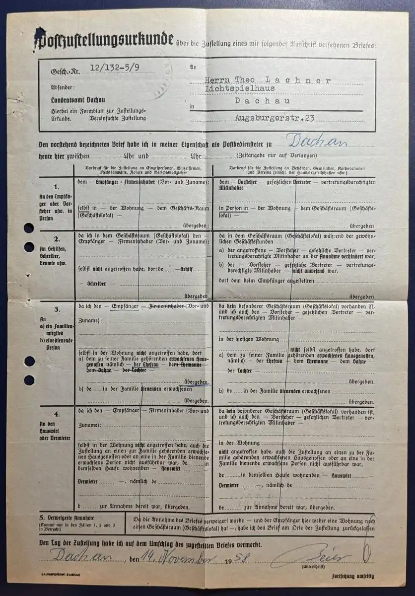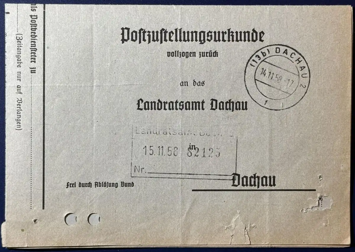 Bund, Postzustellungsurkunde, 1958, gelaufen mit Poststempel vom 14.11.1958 in Dachau, die Urkunde wurde gelocht und hat Heftklammerspuren, Erhaltung siehe Scan.