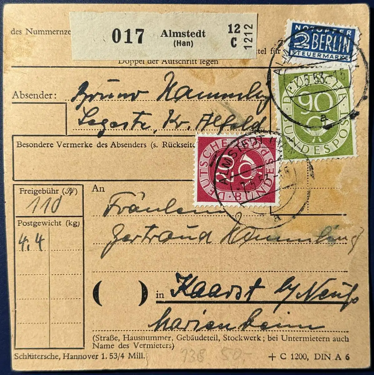 Bund, Paketkarte, 1953, Mischfrankatur, bestehend aus Mi.Nr. 130 und 138, gelaufen mit Poststempel vom 07.05.1953 von Almstedt nach Kaarst.