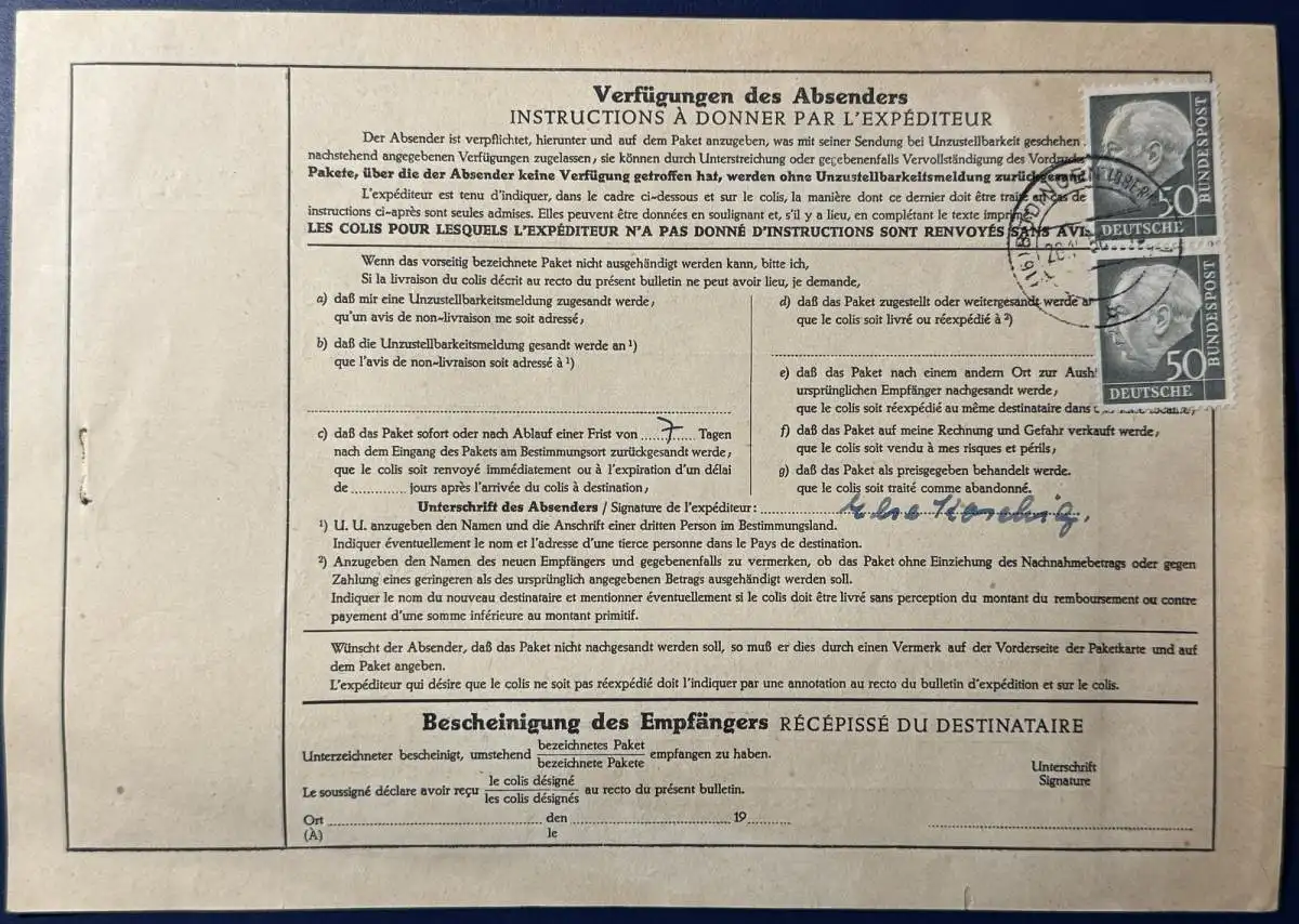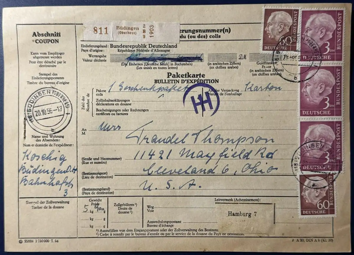 Bund, Paketkarte Ausland, 1956, Mischfrankatur, bestehend aus 3x Mi.Nr.196 (3er Streifen senkrecht), 2x Mi.Nr.189 (Streifen senkrecht) und 2x Mi.Nr.190 (Einzelmarken), gelaufen mit Poststempel vom 20.10.1956 von Büdingen (Oberhessen) nach Cleveland/Ohio USA, Leitvermerk Hamburg 7.