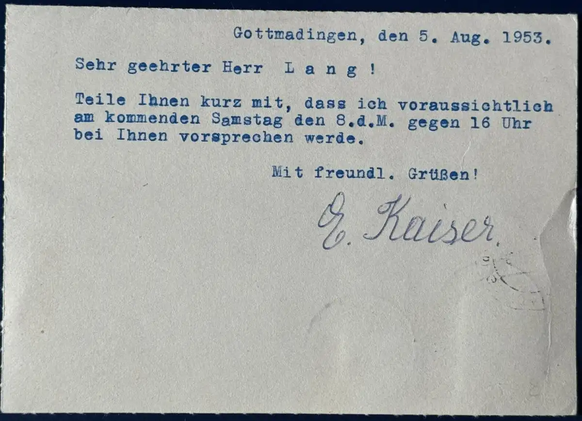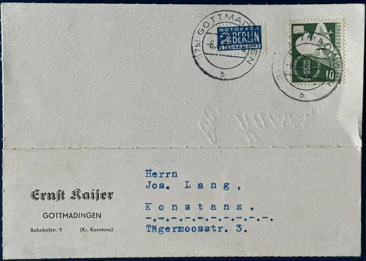 Bund, Bedarfspostkarte, 1953, frankiert mit Mi.Nr.168 und Notopfer, gelaufen mit Poststempel vom 06.08.1953 von Gottmadingen nach Konstanz, Karte hat leichten Stoß auf der rechten Seite (siehe Scan), ansonsten sehr gut erhalten.