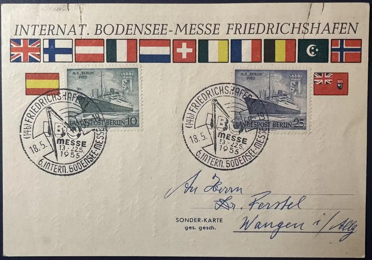Sonderpostkarte, Internationale Bodensee-Messe Friedrichshafen, Mischfrankatur, bestehend aus Berlin, Mi.Nr. 126/127, gelaufen mit Sonderstempel der Bodensee-Messe vom 18.05.1955 von Friedrichshafen nach Wangen i. Allgäu. Die Karte hat Büroklammerspuren auf der Vorderseite (siehe Scan), ansonsten sehr gute Erhaltung.