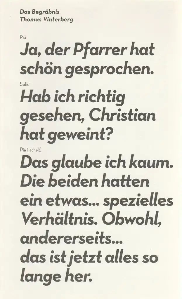 Regie: Thomas Vinterberg. Bühne und Kostüme: Johannes Schütz. Musik: Zbigniew Preisner. Mitwirkende: Michael König, Corinna Kirchhoff, Martin Wuttke, Oliver Stokowski, Christiane von Poelnitz, Dörte Lyssewski, Johanna Wokalek, Tilo Nest, Sebastian Blin / Valentin Fink / Bernhard Mendel - Theaterprogramm, Opernprogramm, Ballettprogramm, Musicalprogramm, Konzertprogramm, Theatermemorabilia, Programmhefte Sammlung, deutsche Theatergeschichte.