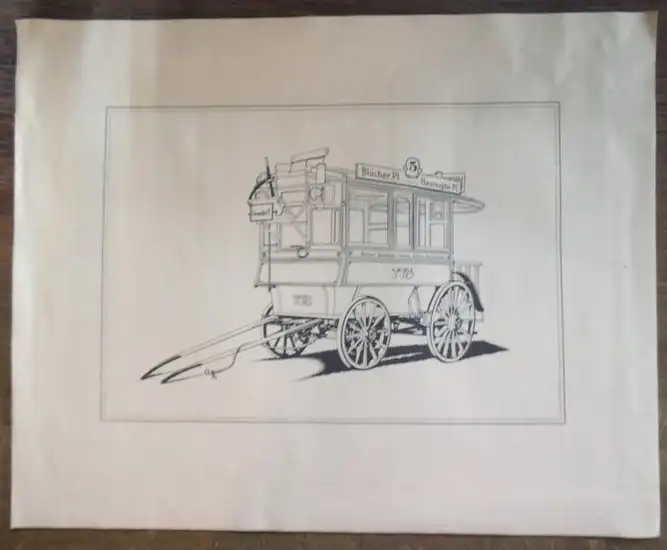 Freie Beschreibung: Blattgröße: 40 x 50 cm, Druckgröße 25 x 36 cm. 6 Blatt Schwarz-Weiß Drucke mit gezeichneten Ansichten von historischen Autobussen (Eindecker und Doppeldecker) aus verschiedenen Jahrzehnten des 20. Jahrhunderts, die in Berlin zum Einsatz kamen. Die Drucke sind an den linken Seitenrändern teilweise etwas geknickt, sonst guter Zustand