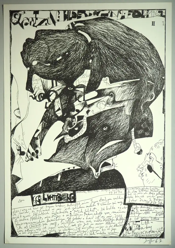 Verworfene Fassung, Auflage nur 100 (!) Exemplare. Unter der Darstellung in Bleistift SIGNIERT (monogrammiert), zudem in der Platte monogrammiert, datiert u. bezeichnet: "Es war Pause, gelieb(t)e Leute, für die 1. Folge hab ich mir ein Haus gekauft; nun bin ich wieder arm, daher diese 2. Folge. 15.8.67 Janssen". - "Wortreiche", physiognomisch abstrahierende Darstellung des Aufklärers Lichtenberg - "Sinn wird Unsinn, Wohltat Plage" (Mephisto) - mit integriertem Selbstporträt des staunenden Zeichners im Profil nach links. - Hermann Laatzen, ein bekannter Buchhändler, Verleger u. Antiquar in Hamburg, war ein früher Förderer Janssens. - Verso editor. Notiz des Kenners u. Sammlers. Gutes Exemplar der seltenen Variante