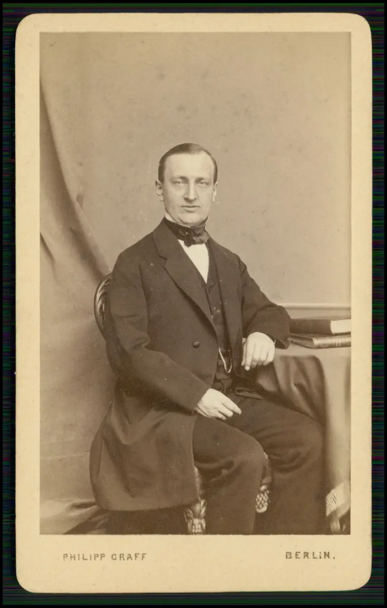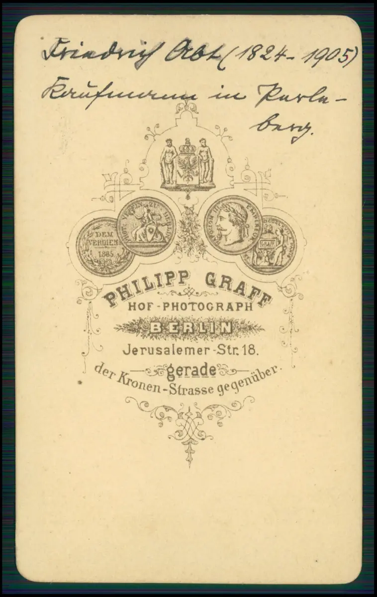 Berlin – Studioaufnahme Friedrich Abt (1824–1905), gefertigt vom Hofphotographen Philipp Graff, Jerusalemer Straße 18, Berlin. Edle Carte-de-Visite (CDV) aus der Zeit um 1870–1880, auf hochwertigem Karton mit dekorativem Atelier-Rückseitendruck.