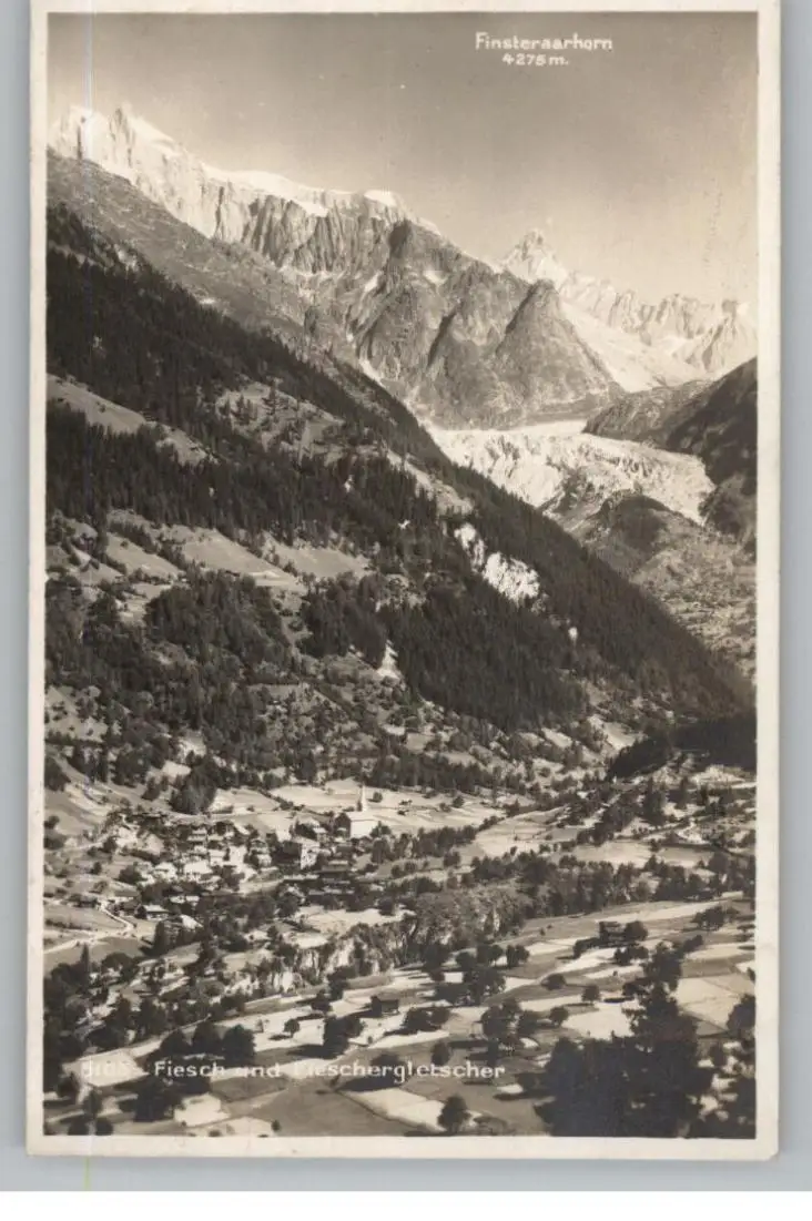 CH 3984 FIESCH (Gorms) VS, Blick über den Ort mit Fieschergletscher, 1930, rücks. Klebereste