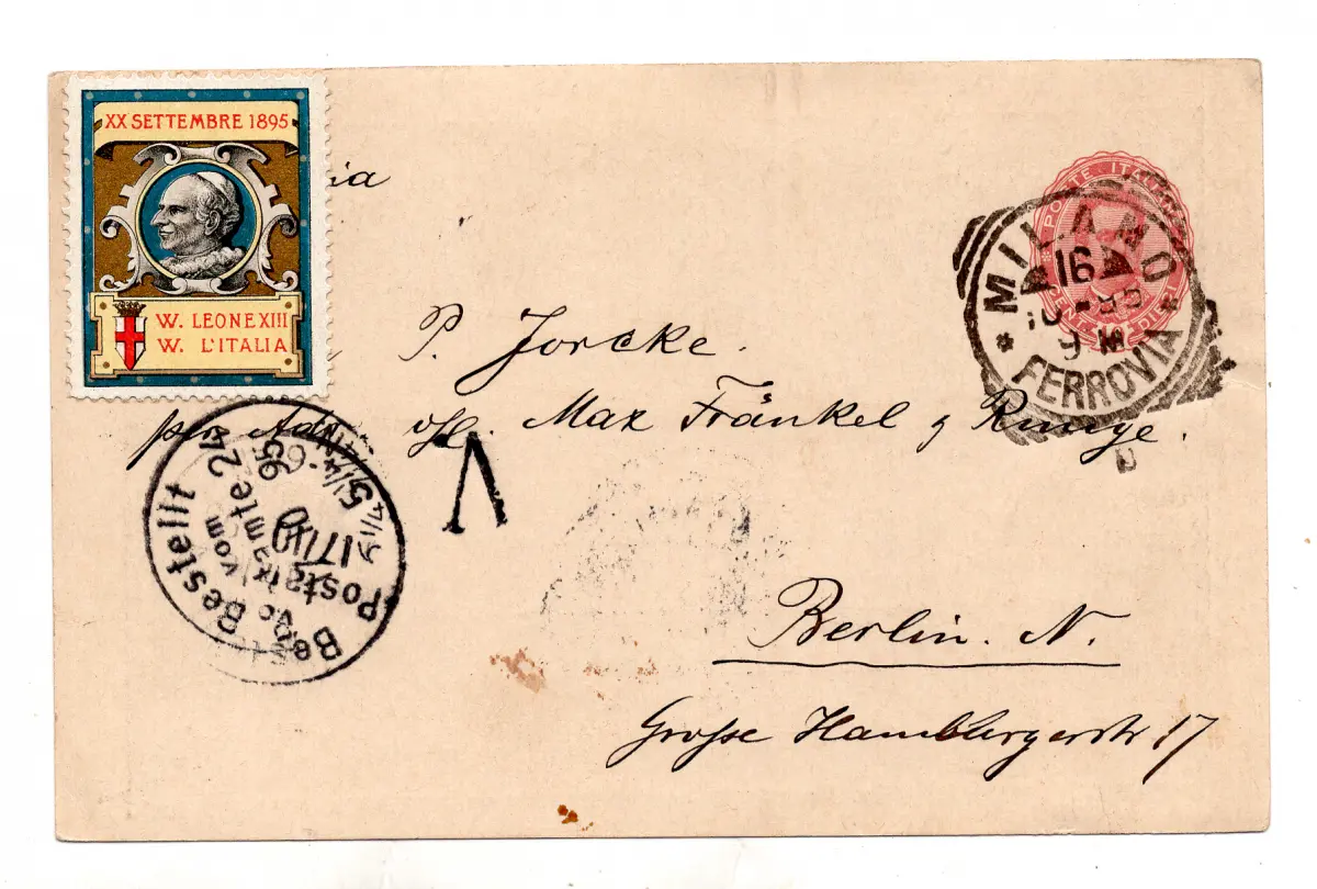 - C.P. Befreiung Roms Nr. C 28 reiste am 16.10.95 von Mailand nach Berlin - neben Erinnofilo Erinnerung W Leo XIII - W Italien - Uncommon Nr. 1036/18