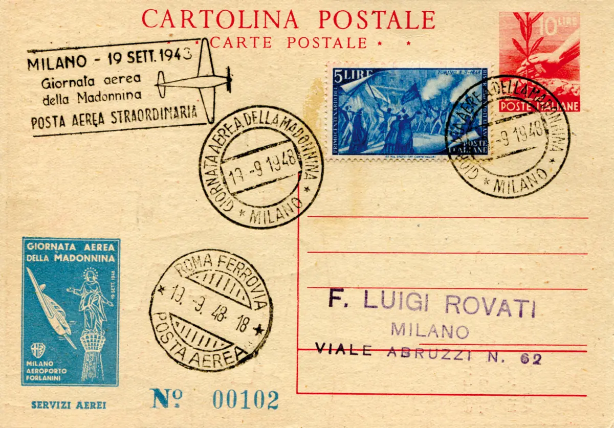 C.P. Democratica l. 10 private Madonna Air Day AK - C.P. Democratica l. 10 feierlicher privater Madonna Air Day (Kat. Interitalia Nr. 148) - nummerierte Ausgabe mit Sonderannullierung und Annullierung der Ankunft in Rom - Schön und ungewöhnlich - Kat. euro 200 Cod. 1043/16