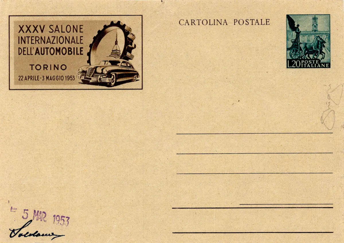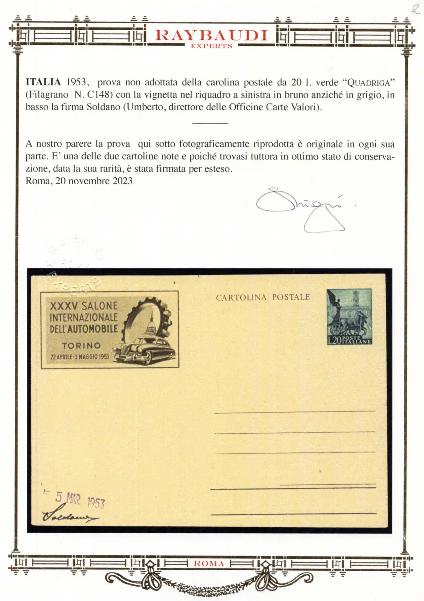 C - C.P. Lire 20 Salone dell'Auto Nr. C 148 - Beweis nicht angenommen mit der Vignette im linken Kasten in braun statt grau - Unten Unterschrift von U. Soldan damals Direktor des Off. Wertkarten - Sehr selten, nur zwei bekannte Postkarten - Zert. Ray. oro Cod.1136/182