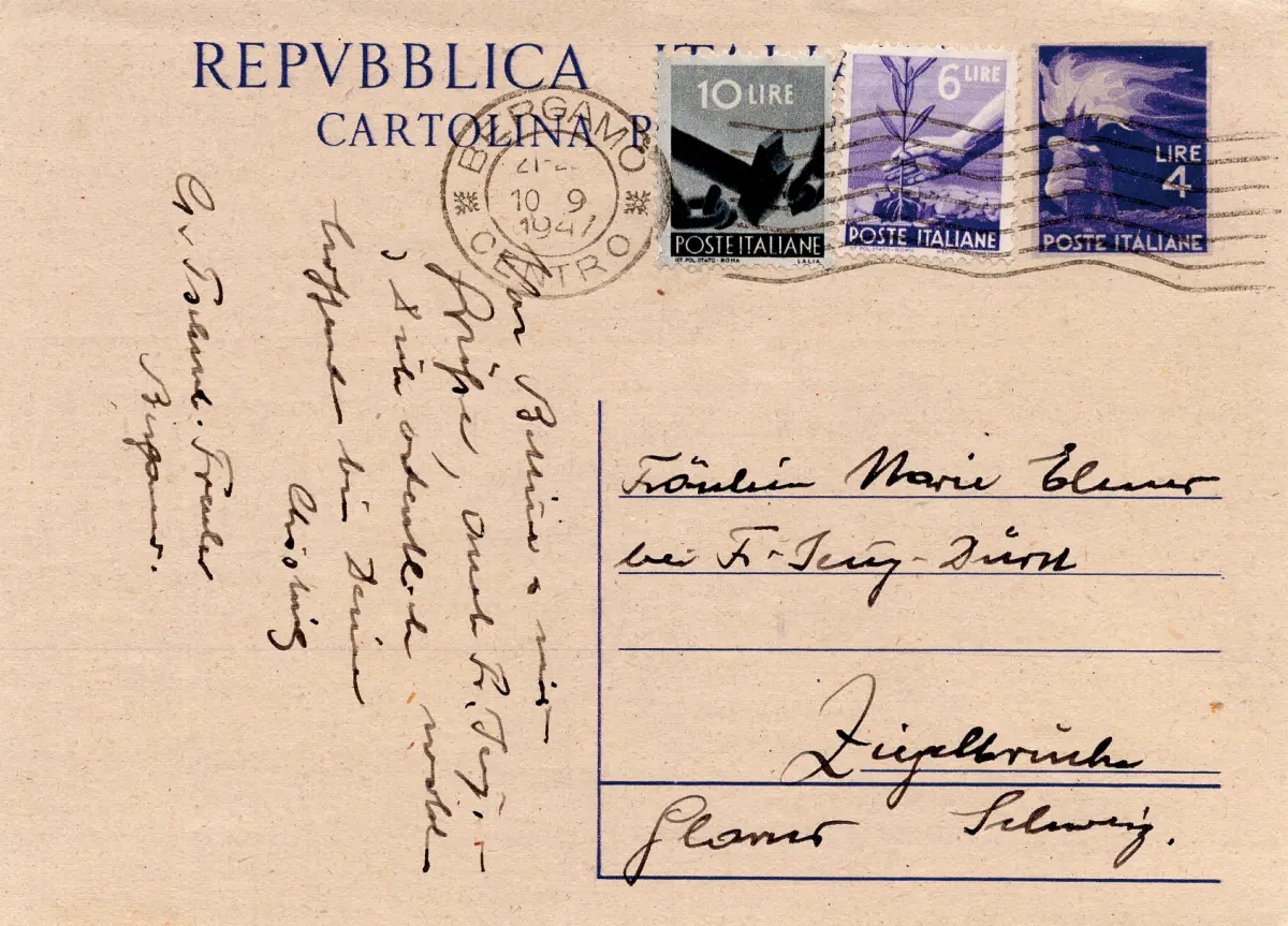 Postkarte - C.P. Lire 4 Democratica Nr. C 133 am 10.9.47 ins Ausland gereist im Tarif 20 Lire mit zusätzlichen Marken - perfekt, ungewöhnlich Cod. 1103/17