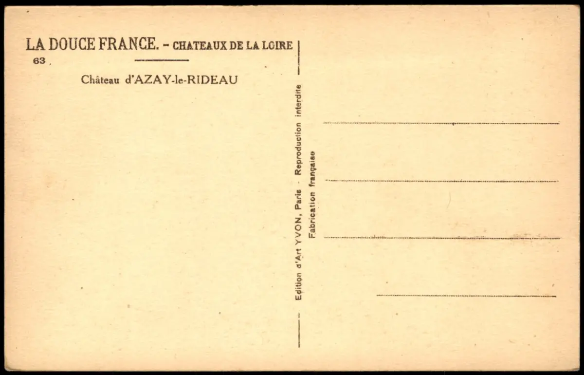 Infos: Ansicht des Château d'Azay-le-Rideau, einem der berühmten Schlösser der Loire, aus der Serie 'La Douce France'. Die Karte wurde von Edition d'Art YVON, Paris, herausgegeben und trägt die Seriennummer 63. Es handelt sich um eine französische Produktion, deren Reproduktion untersagt ist.