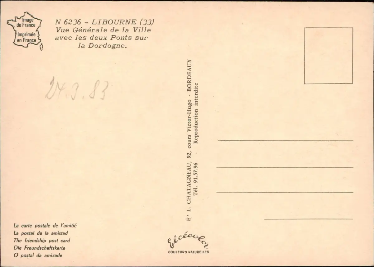 Infos: Luftaufnahme von Libourne mit einer Gesamtansicht der Stadt und den beiden Brücken über die Dordogne. Die Karte wurde von L. Chatagneau, 92, cours Victor-Hugo - Bordeaux, herausgegeben und trägt die Seriennummer N 6236. Sie wurde in Frankreich gedruckt ('Imagede France Imprimée en France') und ist mit dem Branding 'Elcécolor COULEURS NATURELLES' versehen. Der Text 'Reproduction interdite' weist auf Urheberrechtsschutz hin. Die Karte ist auch als 'The friendship post card' in mehreren Sprachen bezeichnet.