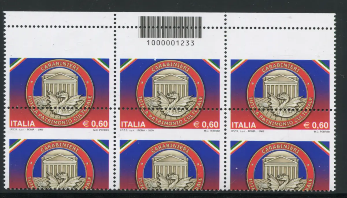 Comando Carabinieri Barcode Sorte Vollgummi - Comando Carabinieri Nr. 3083 Sechserblock b. von f. mit stark vertikal verschobener Verzahnung - Ein Exemplar trägt die Barcode-Nummern in der Vignette (Kat. Einheitliche Nr. 3135Ba + 3135Da) - Kat. 705 Code 826/3