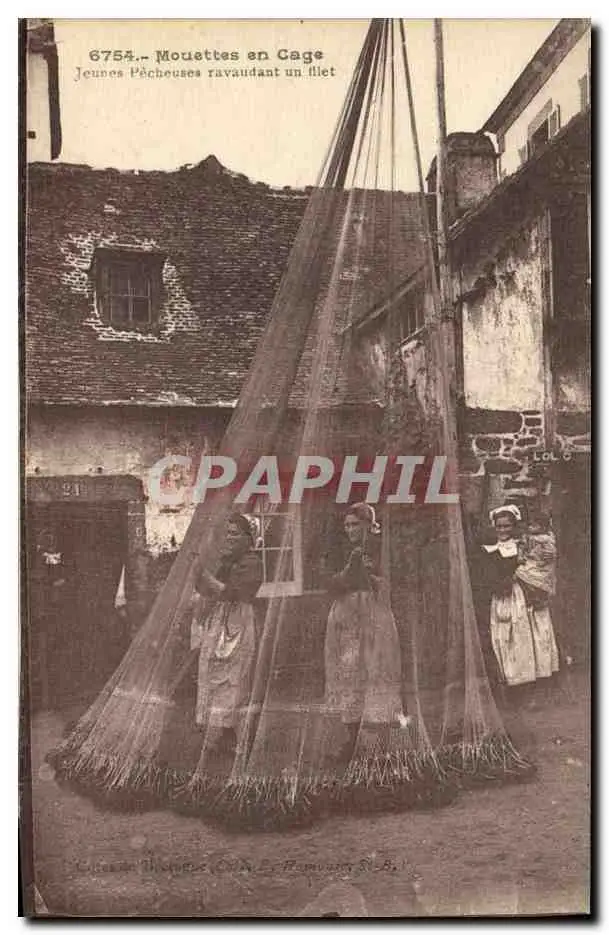 Cartes postales Peche Mouettes en cage Jeunes Pecheuses ravaudant un filet