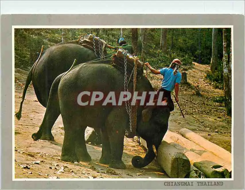 Cartes postales moderne Chiangmai Thailand Two Trained Elephants Lifting a Heavy Teak Wood Log in the Forest of Chiangma