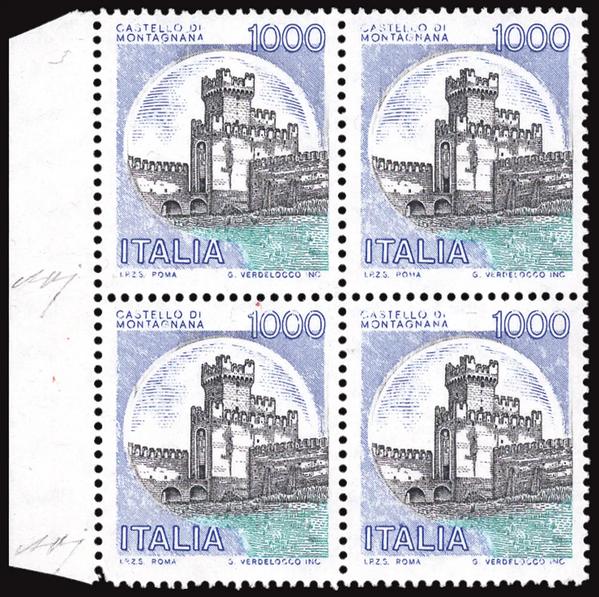 MNH - Vollgummi - - Castelli Lire 1.000 Nr. 1527 Quartina b. di f. ohne Druck des orangefarbenen Bodens - Naturmarke Castello Celeste (Bolaffi Nr. 1632B) - ein defektes Exemplar - Selten - Zert. Bolaffi 35% - Gelegenheit für Emissionsspezialisten Cod.746/182