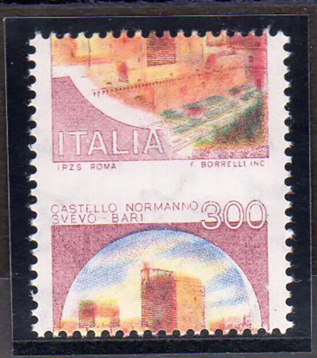 Castelli Lire 300 Sorte verschobene horizontale Verzahnung Vollgummi MNH - Castelli Lire 300 Nr. 1518 stark vertikal verschobene horizontale Verzahnung - Schlossname und Wert in der Mitte - Schön und ungewöhnlich Cod. 609/15