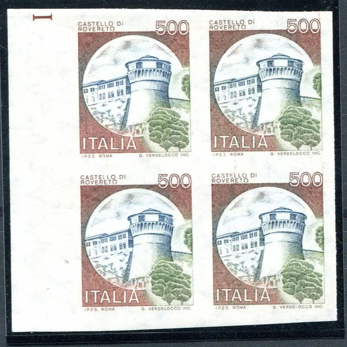 Vollgummi - Castelli Lire 500 Quartina ungezähnt, von wunderschöner Qualität. In der Regel weist diese Sorte Buntstiftspuren auf - Sie können auch ein horizontales Paar für 250,00 Euro erwerben welches aus diesem Viertel geschnitten wird - RAR Nr. 158/WEB