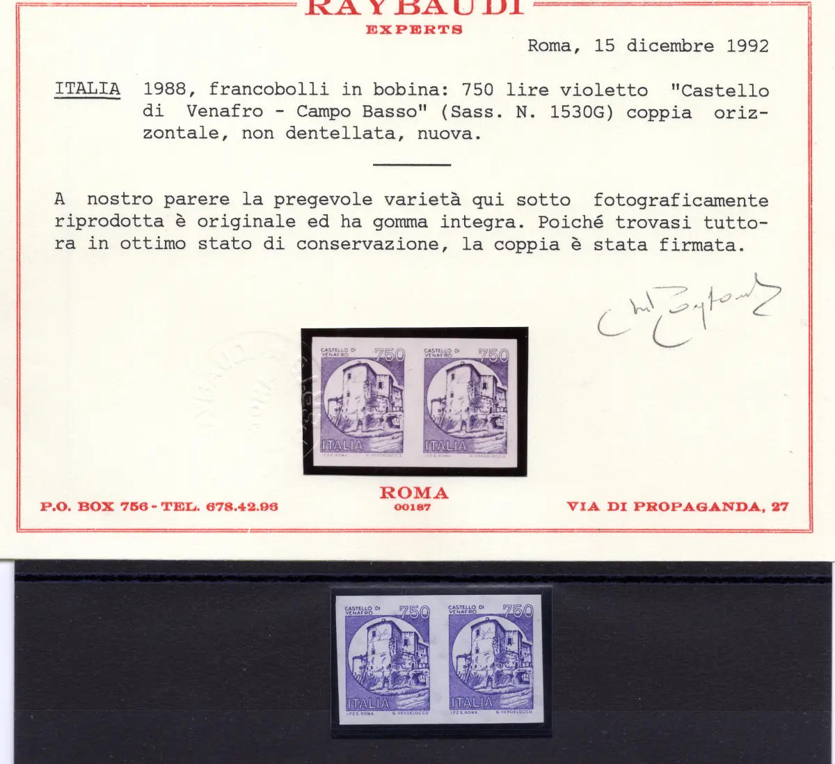 MNH Vollgummi - Castelli Lire 750 Ausgabe pro Spule Nr. 1530G ungezähntes horizontales Paar - Seltene nicht katalogisierte Sorte - Cert. Ray. Cod. 672/16