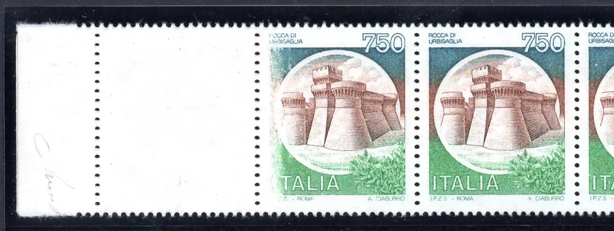 MNH - Vollgummi - - Castelli Lire 750 Nr. 1524A waagerechter Zehnerstreifen mit dem ersten Albino-gedruckten Exemplar - wirkungsvolle Vielfalt und Seltenheit Cod.732/182