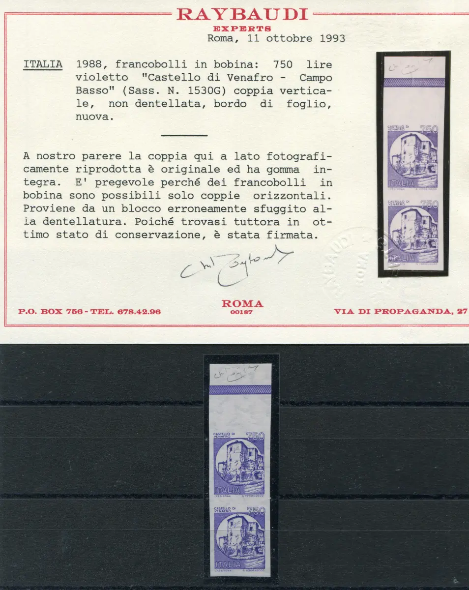 Castelli Lire 750 Sortenmaschinen vertikales Drehmoment Vollgummi - MHN - - Castelli Lire 750 Nr. 1530G Emission für ungezahnte vertikale Drehmomentverteiler mit hohem Blattrand und Farblinie (Sass. spec. n. 1155D Eb) - Dies ist zweifellos die seltenste Sorte, die für die in Bob ausgegebenen Werte Cod. 742/14 bekannt ist
