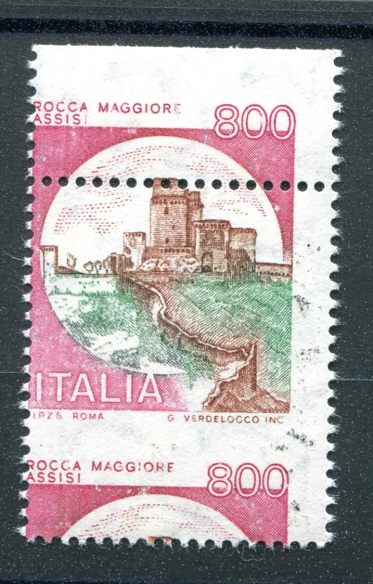 Castelli Lire 800 Sorte verschobene Verzahnung ** (MNH) - Castelli Lire 800 schönes Exemplar mit verschobener Verzahnung Blattrand oben, Nennwert unten und am Rand wiederholt - stammt aus der ersten horizontalen Reihe des Blattes - selten Cod.358/W