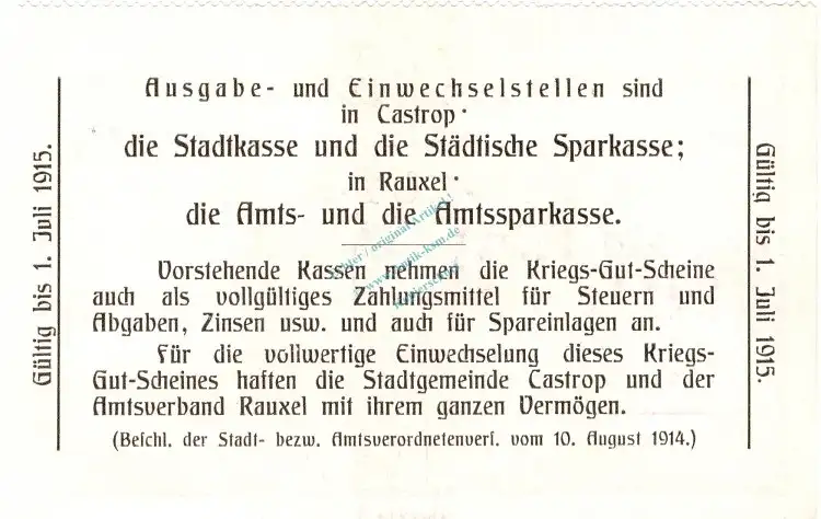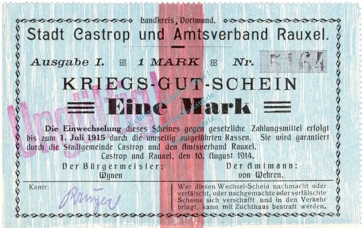 Castrop , Notgeld 1 Mark Schein in kfr. Diessner 59.2.c , Westfalen 1914 Notgeld 1914-15