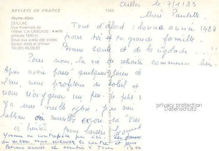 Ceillac Vue hivernale de l'Hôtel La Cascade Alpes Ceillac postalisch nicht gelaufen 1983 Erhaltung siehe scans [FriedD77] Frierer