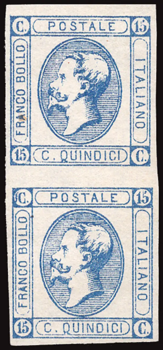 MNH - Vollgummi - Cent. 15 Lithographien Nr. 13 gut marginiertes senkrechtes Paar davon oben links ein Exemplar mit Schlangensorte - Cod. 183/17