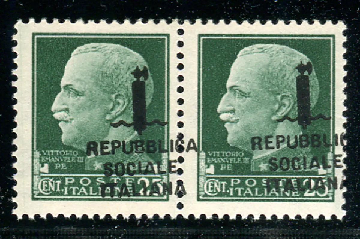 Cent. 25 Sorten Pferdeaufdruck Vollgummi - Cent. 25 n. 491pn Paar mit stark waagerecht verschobenem Aufdruck (zu Pferd) - Das Exemplar links (erste Blattreihe siehe Nr. 491pn) - Interessanter Cod. 182/13