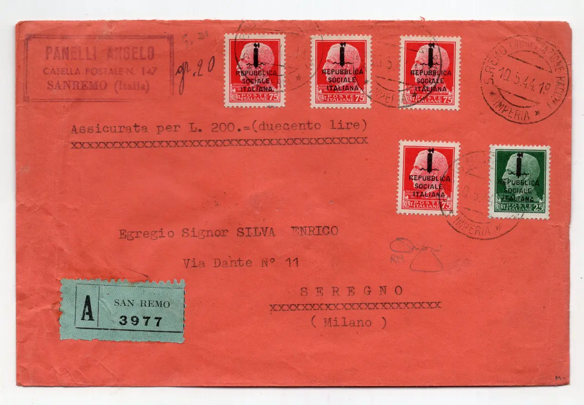 Umschlag - Centband. 75 (Auflage Rom) Nr. 494 vier Exemplare + Ergänzung Nr. 491 auf versichertem Umschlag von Sanremo nach Seregno am 10.5.44 - Seltene Mehrfachfrankatur dieses Wertes - Genauer Tarif für Briefe zwei Häfen (gr. 20) versichert Lire 200 - für Spezialisten - S. Vignati Cod. 2942 / WEB