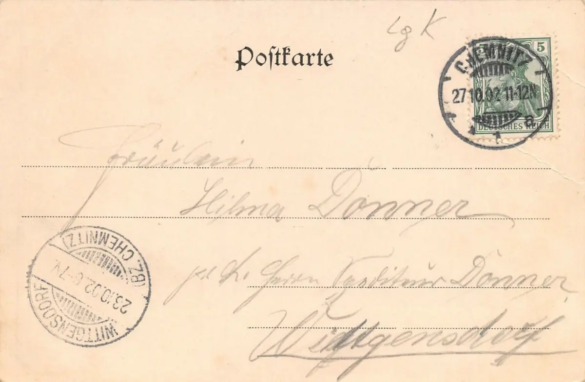 Rückseite: gelaufen 1902 von Chemnitz nach Wittgensdorf
