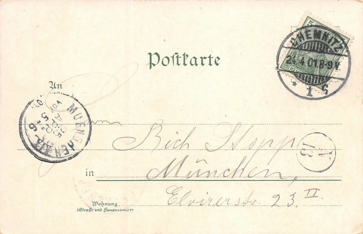 Rückseite: gelaufen 1901 von Chemnitz nach Muenchen