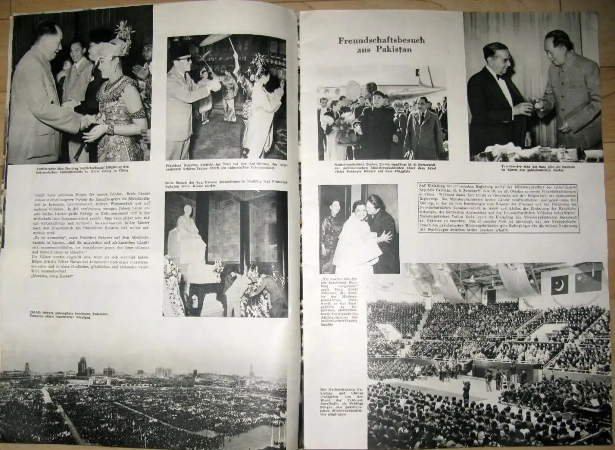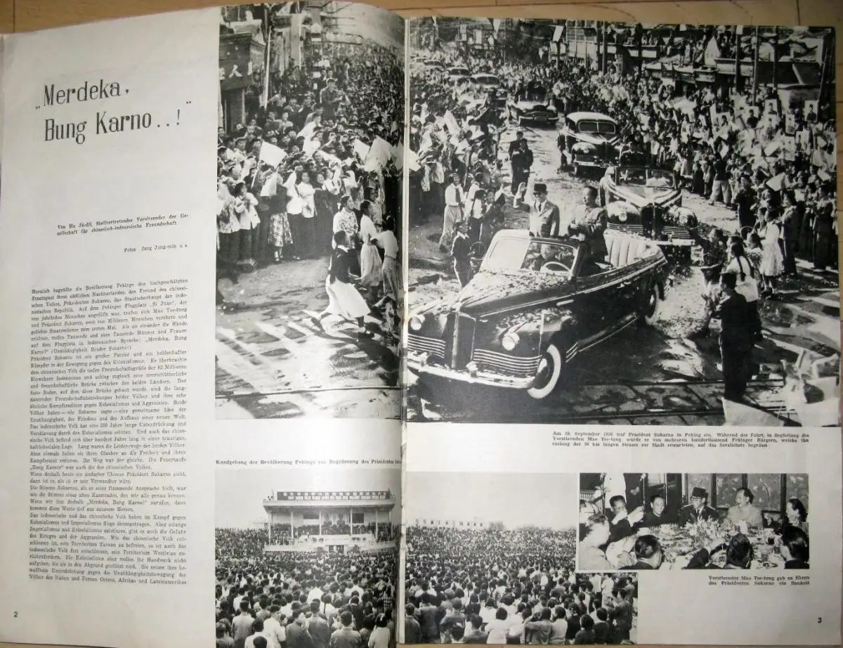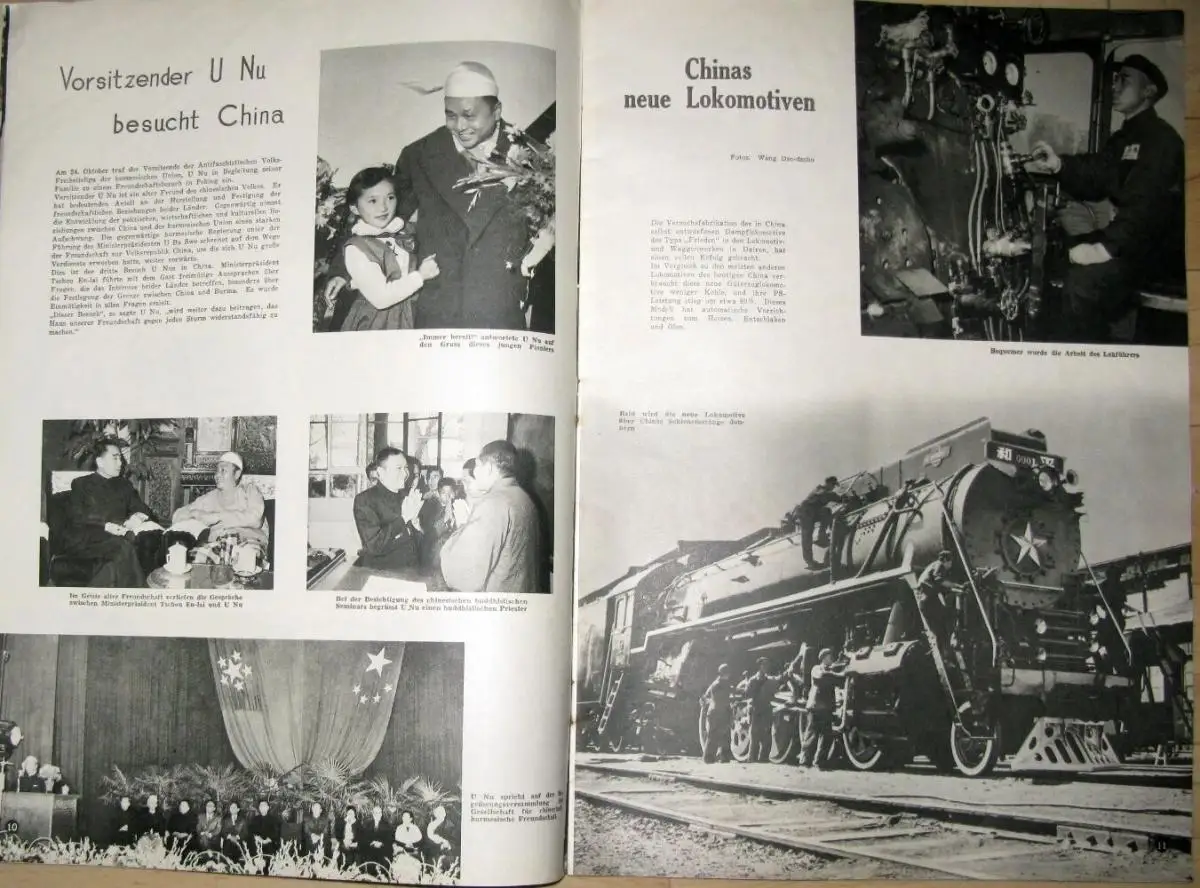 guter Zustand, geringe Gebrauchs- und Alterungsspuren: Klammerrost - Seiten überwiegend sauber und ordentlich - Umschlag und Seiten teils etwas eselsohrig, Zur 90. Wiederkehr des Geburtstages Sun Yat-sens (1866 — 1925) - „Merdeka, Bung karno . . . !" Freundschaftsbesuch aus Pakistan - „Ehren wir Lu Hsün, indem wir in seinem Geiste mutig vorwärtsschreiten!" - Willkommen für einen alten Freund: Vorsitzender U Nu besucht China - Chinas neue Lokomotiven - Eine Reise nach Indonesien - Das Leben der Familie Wu - Archäologische Funde in Sian - Kantonesische Kochkunst - Bambusfloß auf dem Futschun-Fluß in Tschekiang - Schaosching — Stadt der Kanäle - Großmütter auf der Schulbank - Bambus - Neue Maurergeräte - Abends in Tientsin - Ein modernes Kabelwerk - Gesang und Tanz aus der Steppe - Kunstausstellungen in Peking - Hilfe für Ägypten — Kampf den Aggressoren!, kartoniert, ca. 26 x 37, 40 Seiten mit zahlreichen Bildern