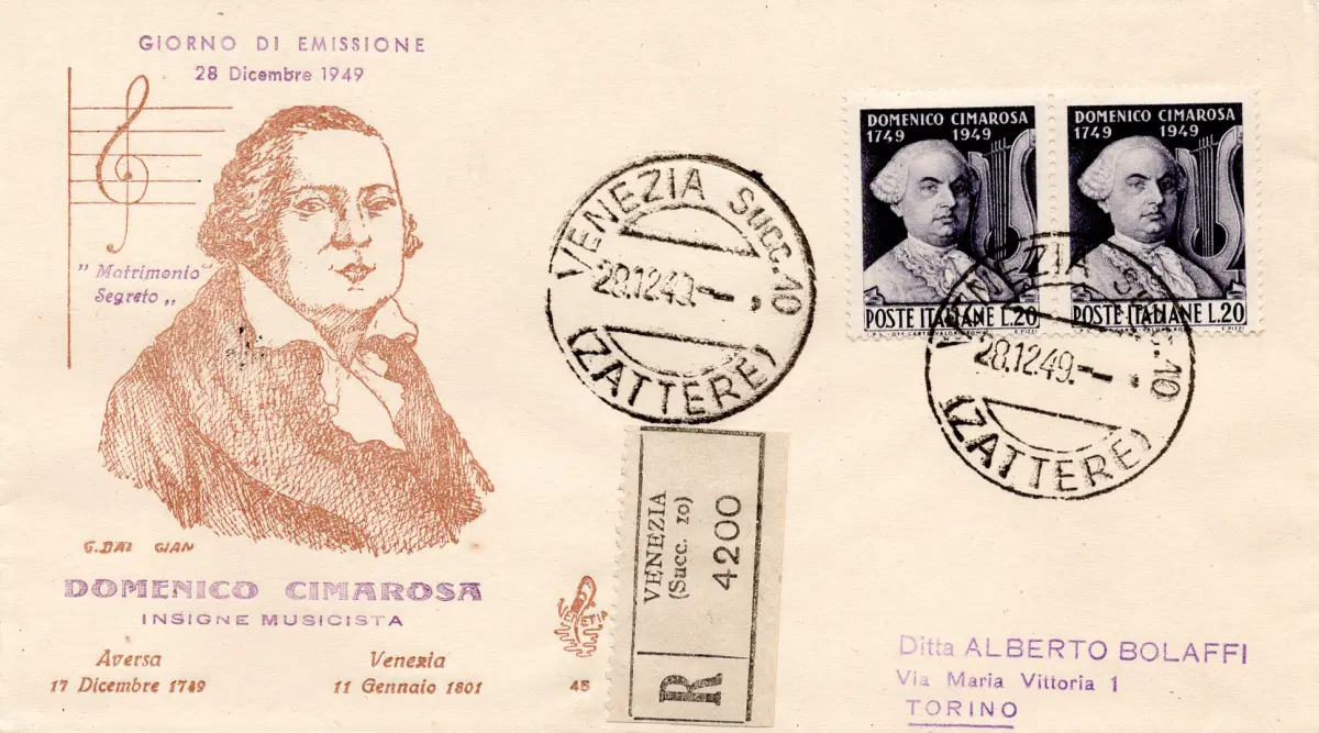 Umschlag - Cimarosa Nr. 615 Paar auf Umschlag für Turin mit Ankunftsstornierung Cod. 454/17