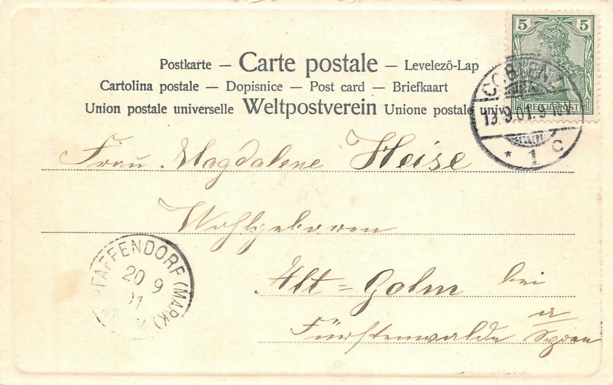 Rückseite: gelaufen 1901 von Coblenz nach Pfaffendorf